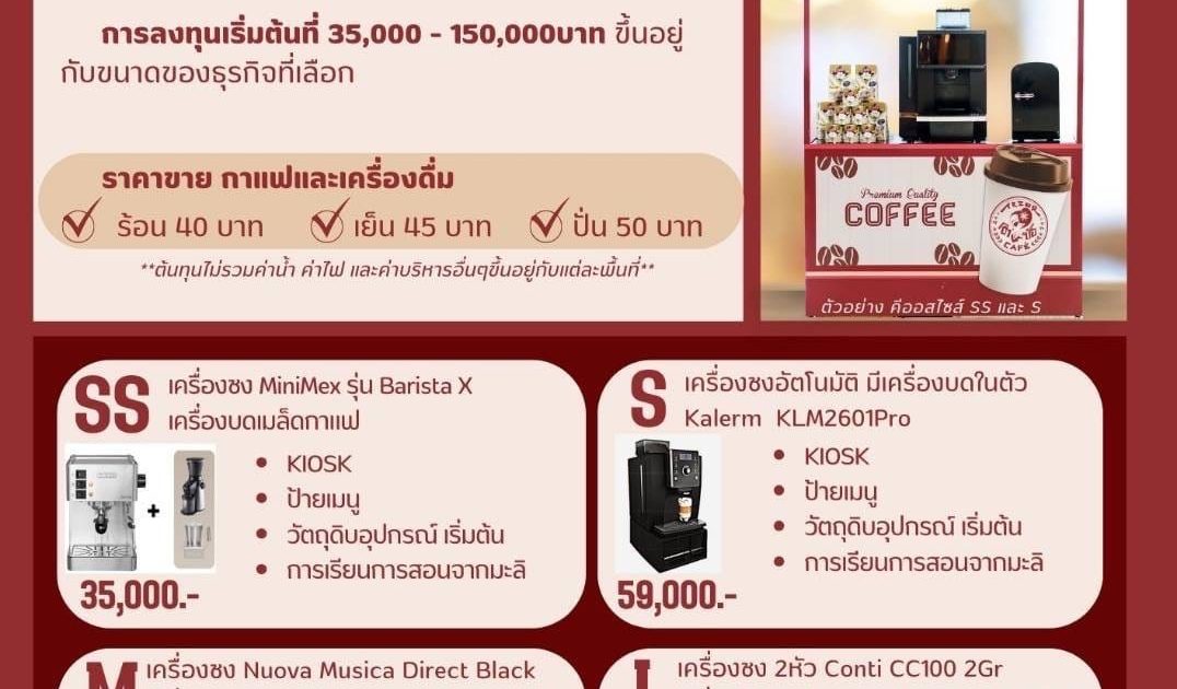 การลงทุนเริ่มต้นที่ 35,000 – 150,000บาท ขึ้นอยู่กับขนาดของธุรกิจที่เลือก โดยต้นทุนวัตถุดิบของกาแฟในแก้วที่มีส่วนผสมเยอะสุด จะอยู่ที่แก้วละ 15 บาท